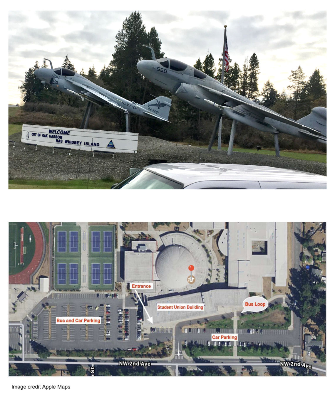 While going south on WA 20, turn east/right on Ault Field Road (you will see the NAS Whidbey Jet Static Display).